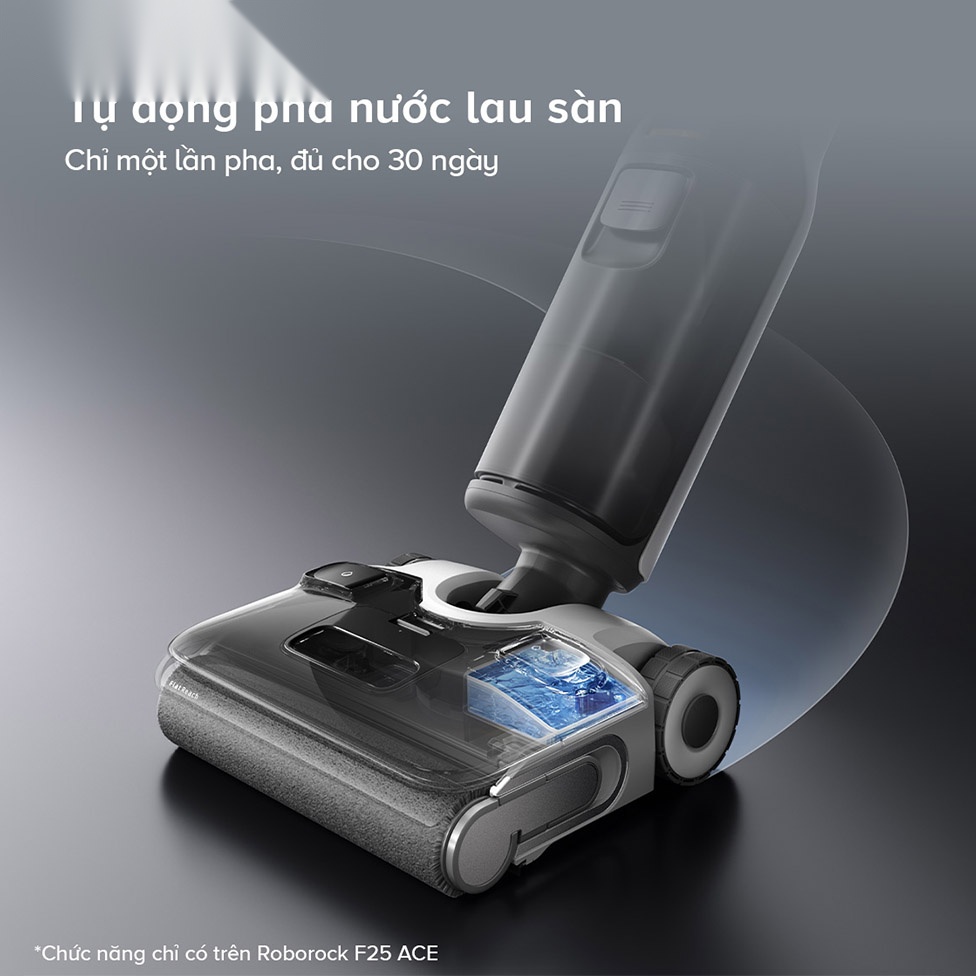 Máy hút bụi lau nhà cầm tay Roborock F25 ACE tích hợp công nghệ tự động phân phối dung dịch vệ sinh thông minh, giúp điều chỉnh lượng dung dịch dựa trên độ bẩn của sàn nhà. Với tính năng này, người dùng có thể sử dụng máy trong suốt 30 ngày mà không cần thêm dung dịch thủ công.