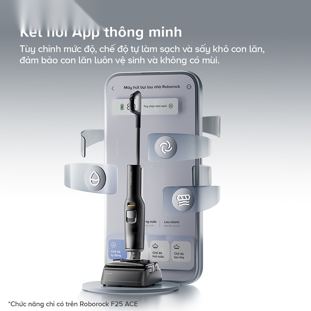 Roborock F25 ACE hỗ trợ kết nối thông qua ứng dụng di động, cho phép bạn dễ dàng điều chỉnh các thông số như lực hút, lượng nước, và nồng độ dung dịch vệ sinh. Bạn có thể thiết lập các chế độ làm sạch riêng cho từng loại sàn như sàn đá cẩm thạch hoặc sàn gỗ, mang đến trải nghiệm làm sạch được cá nhân hóa hoàn toàn. Hơn nữa, bạn còn có thể cài đặt chế độ tự động giặt và sấy khô từ xa thông qua ứng dụng di động, mang lại sự tiện lợi tối đa khi không có mặt tại nhà.