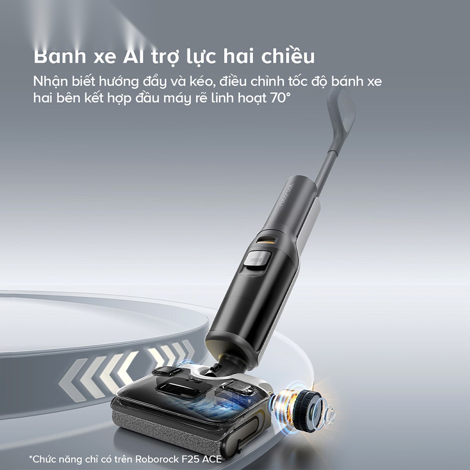 Roborock F25 ACE sử dụng bánh xe thông minh Slide Tech để hỗ trợ thao tác đẩy và kéo, giúp việc vận hành trở nên nhẹ nhàng và đơn giản hơn bao giờ hết. Máy có khả năng cảm biến hướng di chuyển và điều chỉnh tốc độ của các bánh xe thông minh, giúp cho các thao tác đẩy và kéo đều hết sức mượt mà, bất kể bạn di chuyển tới hay lui. Đồng thời, Roborock F25 ACE cũng tính toán lực xoay, giúp các thao tác xoay chuyển trở nên dễ dàng với sự ổn định hoàn hảo.
