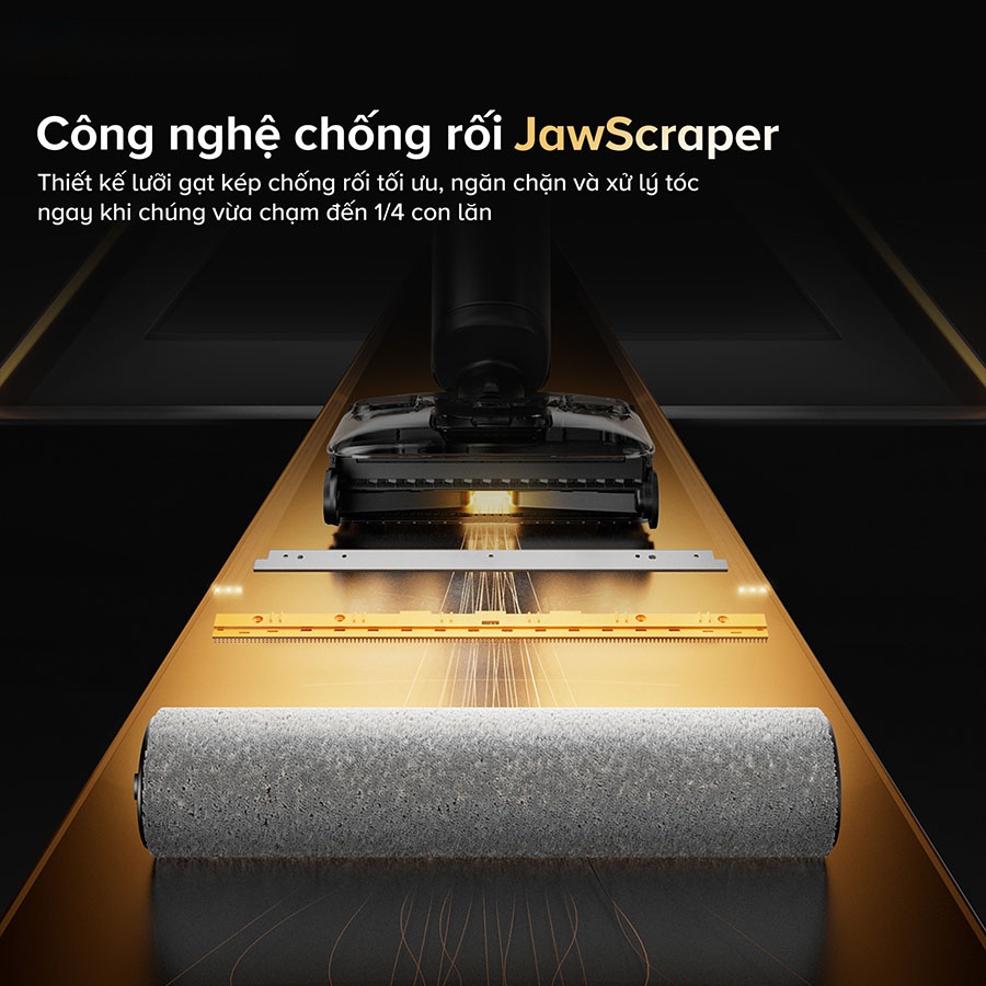 Một trong những vấn đề lớn nhất khi sử dụng máy hút bụi là tình trạng tóc và lông thú cưng mắc kẹt vào con lăn, làm giảm hiệu suất hút bụi. Roborock F25 ACE Combo giải quyết triệt để vấn đề này với công nghệ chống rối Jaw Scraper, sử dụng thiết kế lưỡi gạt kép để ngăn chặn và xử lý tóc ngay khi chúng vừa chạm đến 1/4 con lăn. Nhờ đó, người dùng không còn phải lo lắng về việc gỡ tóc rối thủ công, tiết kiệm thời gian và duy trì hiệu suất làm sạch tối ưu.