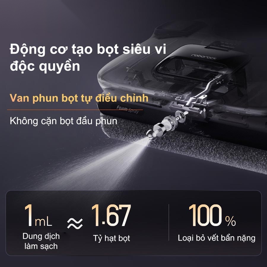 Bên trong Roborock F25 ACE Pro là công nghệ phun bọt Foam Spray có khả năng tạo ra bọt siêu vi mịn gấp 17 lần, đạt tới 1.67 tỷ hạt bọt chỉ với 1 ml dung dịch. Mỗi hạt bọt khi vỡ ra sẽ sinh ra năng lượng vi mô giúp tách vết bẩn khỏi bề mặt nhanh chóng. Cấu trúc phun với van điện từ tinh chỉnh đảm bảo không tồn đọng bọt ở đầu phun, giúp tiết kiệm dung dịch và duy trì hiệu quả phun ổn định.