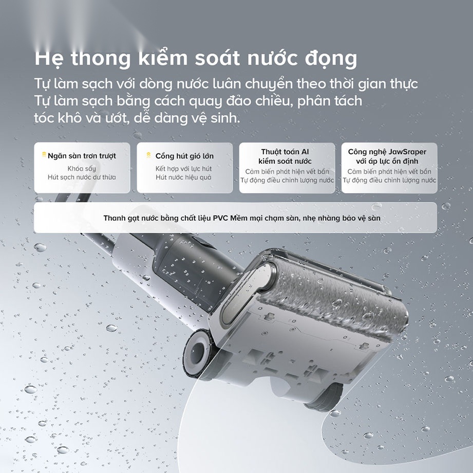 Roborock F25 tích hợp hợp hệ thống kiểm soát nước đọng thông minh, giúp ngăn chặn tình trạng nước dư làm trơn trượt sàn nhà. Dòng nước được luân chuyển theo thời gian thực, kết hợp với cơ chế xoay đảo chiều, thanh gạt nước bằng PVC mềm mại làm sạch nhẹ nhàng nhưng không kém phần triệt để. Đặc biệt, cổng hút gió lớn cùng chức năng hút nước dư hiệu quả giúp sàn nhà khô thoáng sau mỗi lần lau. Hệ thống này còn được trang bị thuật toán AI thông minh, giúp phát hiện và điều chỉnh lượng nước phù hợp cho từng loại vết bẩn.
