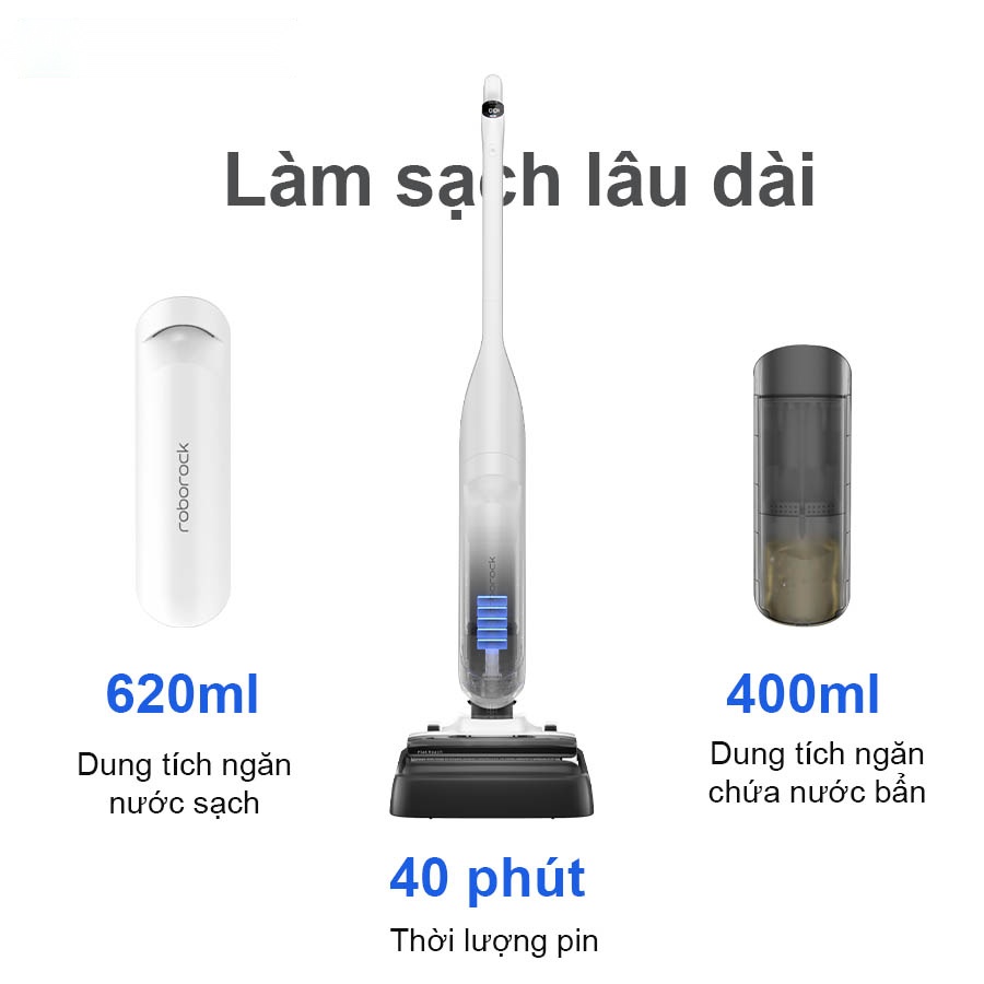 Với bình chứa nước sạch 620ml và bình chứa nước bẩn 400ml, Roborock Flexi Lite được thiết kế để đáp ứng nhu cầu làm sạch mà không cần nhiều lần dừng lại để đổ nước thải.