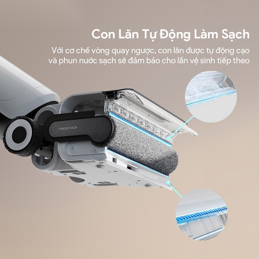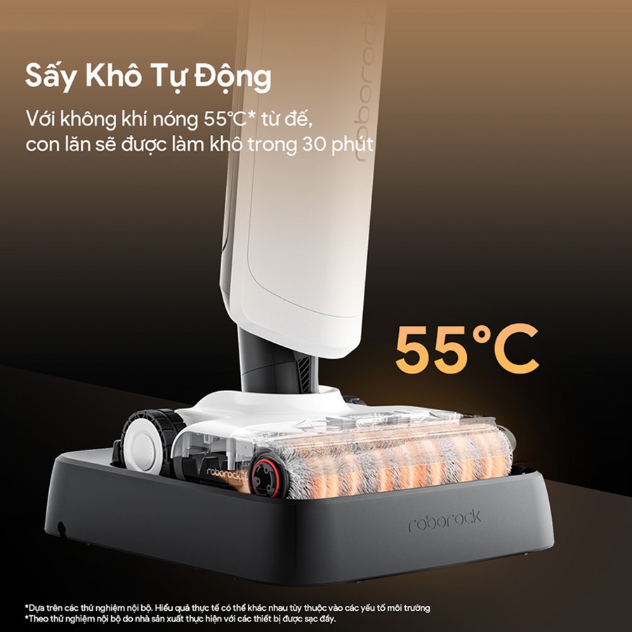 Sử dụng công nghệ làm sạch và sấy khô con lăn tự động của Roborock, giờ đây bạn sẽ không cần lo về việc làm sạch con lăn thủ công như trước nữa. Với tính năng này, con lăn trên Robrock Flexi Pro được cạo và rửa theo hai hướng bằng nước nóng 60°C, kết hợp với luồng không khí nóng 55°C, đảm bảo mọi chỗ trên con lăn đều được vệ sinh và không có mùi hôi trong vòng 30 phút.