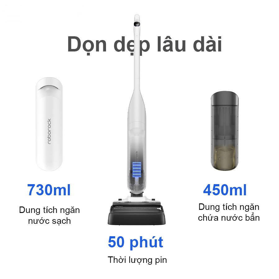 Kết hợp với bình nước sạch 730ml và bình nước bẩn 450ml, Roborock Flexi Pro có thể đáp ứng được nhu cầu làm sạch liên tục mà không cần phải dừng lại giữa chừng để thay nước.