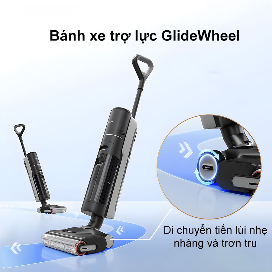 Bánh xe trợ lực GlideWheel được tích hợp trên Dreame H13 Pro mang đến khả năng vận hành vô cùng mượt mà. Điều này không chỉ giúp thiết bị dễ dàng tiếp cận các khu vực khó làm sạch như cạnh góc và tường mà còn đảm bảo thao tác vệ sinh được thực hiện một cách dễ dàng và trơn tru hơn.