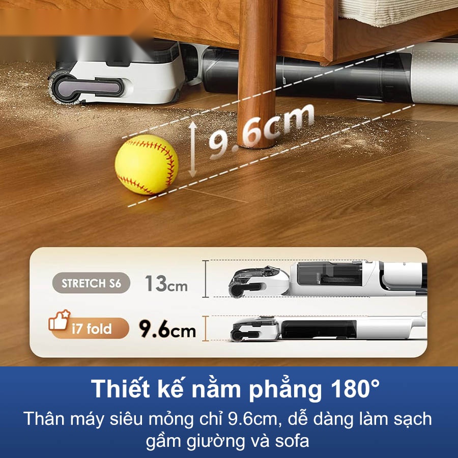Máy hút bụi lau nhà khô ướt Tineco Floor One i7 Fold sở hữu khả năng gập phẳng 180°, cho phép thân máy nằm sát sàn với chiều cao chỉ 9,6 cm. Nhờ thiết kế siêu mỏng này, thiết bị dễ dàng tiếp cận các khu vực khó vệ sinh như gầm giường, gầm sofa hay tủ thấp, nơi bụi bẩn thường tích tụ mà các dòng máy thông thường khó chạm tới. So với các thế hệ trước, thân máy mỏng hơn tới 26%, tối ưu hiệu quả làm sạch ở không gian hẹp.