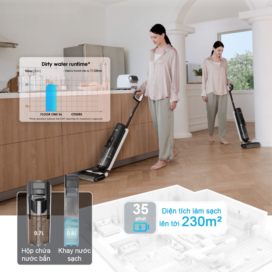 Bên cạnh đó, máy Tineco Floor One S6 có bình chứa nước sạch và bẩn dung tích lớn, cho phép bạn lau chùi khu vực rộng lên đến 230m2 mà không cần phải thêm nước nhiều lần.