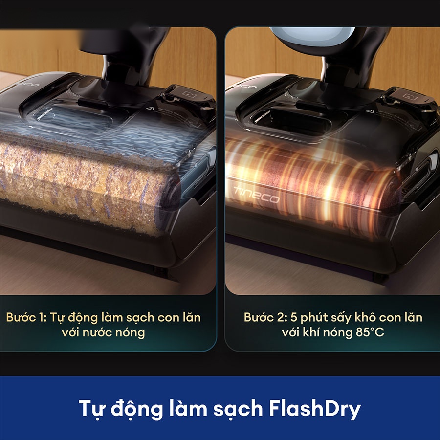Một trong những ưu điểm nổi bật của máy hút bụi lau nhà Tineco Floor One S9 Artist Prime chính là công nghệ FlashDry hiện đại. Thiết bị có khả năng tự động giặt con lăn bằng nước nóng 85°C, làm sạch sâu các loại vết bẩn bám chặt, dầu mỡ hoặc chất bẩn khó xử lý bằng nước lạnh thông thường. Ngay sau đó, máy tiếp tục sấy khô con lăn bằng khí nóng 85°C trong vòng 5 phút. Quy trình vệ sinh, sấy khô khép kín này không chỉ giúp con lăn luôn sạch sẽ, khô ráo mà còn hạn chế sự phát triển của vi khuẩn và nấm mốc, đảm bảo máy luôn trong trạng thái vận hành tối ưu.