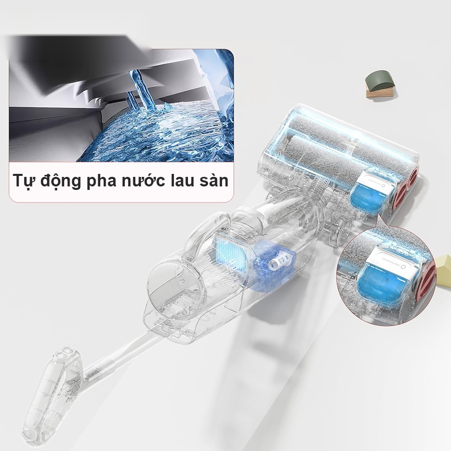 Máy hút bụi Roborock Dyad Pro Combo được trang bị một hộp nước lau sàn nhỏ ở phía bên trong của đầu hút bụi lau nhà khô và ướt. Khi nước sạch đi xuống từ bình chứa, nước lau sàn sẽ được tự động pha theo tỷ lệ phù hợp để thực hiện quá trình lau nhà hoặc làm sạch con lăn.