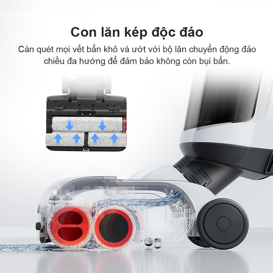 Máy hút bụi Roborock Dyad Pro Combo được trang bị hệ thống DyadPower với 2 con lăn phía trước cùng với một con lăn phía sau xoay ngược chiều nhau. Với cơ chế hoạt động như vậy thì mọi loại chất bẩn, bụi, rác đều được hút hết vào bên trong ngăn chứa nước bẩn của máy dễ dàng.