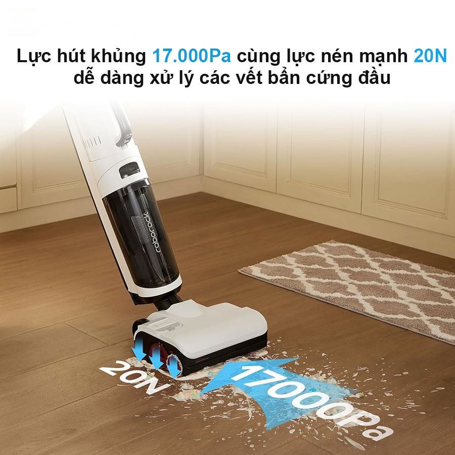 Trang bị đầu hút bụi thảm và sàn, Roborock Dyad Pro Combo sẽ lập tức trở thành một chiếc máy hút bụi cầm tay không dây. Máy có thể hút bụi khô ở trên sàn nhà hay trên thảm trải cực kỳ hiệu quả. Đặc biệt với lực hút lớn lên tới 17.000Pa, mọi bụi bẩn từ các khe kẽ trên sàn nhà hay mắc trong thảm đều được hút sạch sẽ.