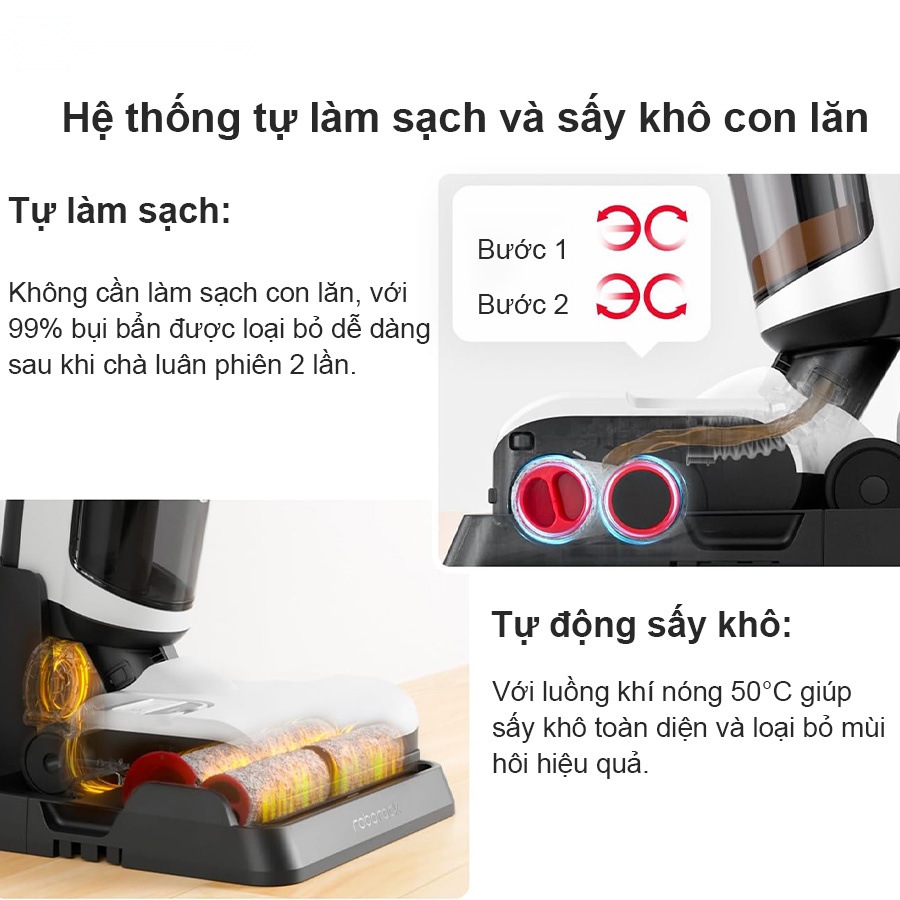 - Hệ thống RevoBrush giúp tự làm sạch và sấy khô con lăn, vệ sinh con lăn sau mỗi lần sử dụng