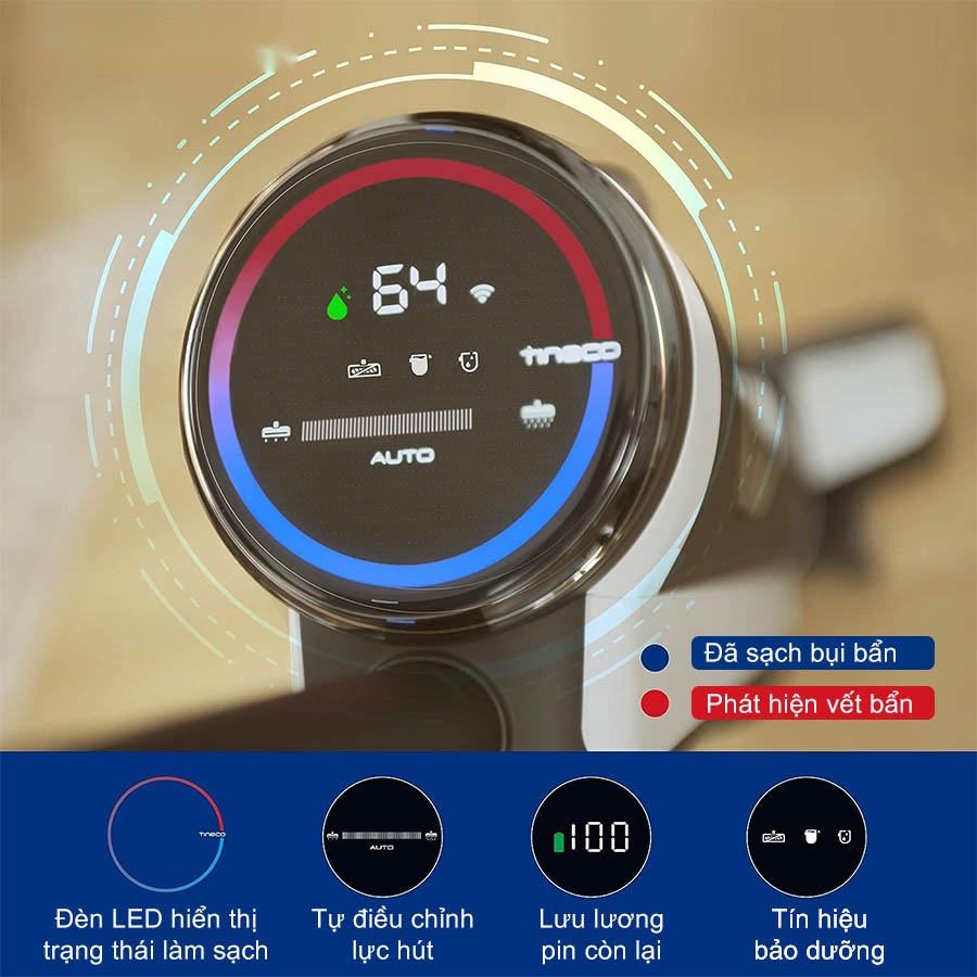 Máy hút cầm tay Tineco Floor One S3 được trang bị màn hình LED sắc nét, hiển thị đầy đủ các thông tin quan trọng về trạng thái làm việc và vệ sinh, giúp bạn dễ dàng theo dõi tình trạng của máy.