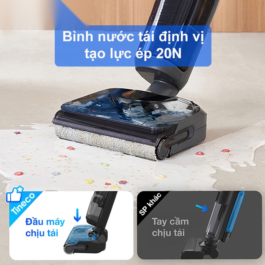 Bình nước sạch của máy hút bụi lau sàn khô ướt Tineco FLOOR ONE S6 Stretch Extreme được đặt ở vị trí mới nhằm tạo lực ép trực tiếp lên mặt sàn, giúp tăng hiệu quả cọ rửa vết bẩn cứng đầu. Cụ thể, thiết kế này tăng thêm 20N áp lực, từ đó giúp người dùng làm sạch nhanh hơn mà không phải ấn tay mạnh. Đồng thời, nó còn góp phần giảm tải trọng lên phần tay cầm, khiến việc điều khiển máy nhẹ nhàng hơn dù phải dọn nhiều khu vực liên tiếp.