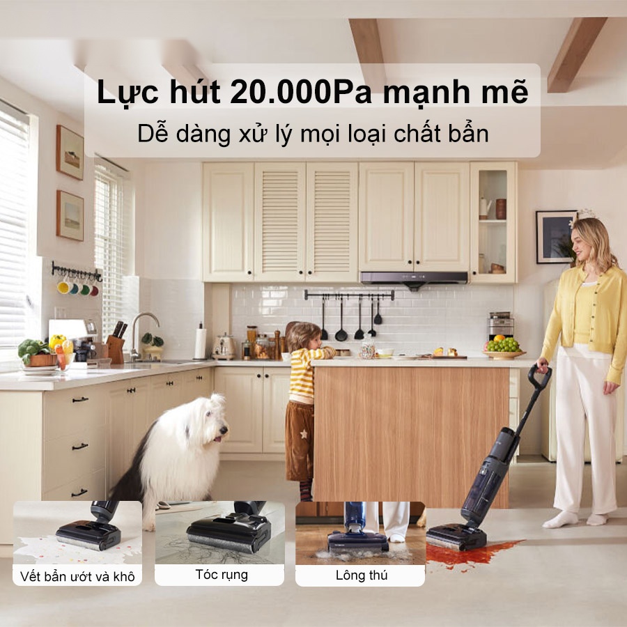 - Lực hút 20.000Pa mạnh mẽ, làm sạch từ bụi mịn đến chất lỏng và lông thú