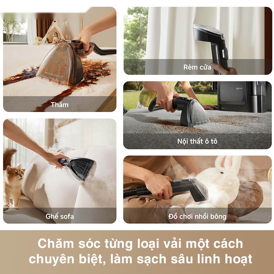 Máy làm sạch thảm di động Dreame N20 Steam được thiết kế để xử lý hiệu quả các vết bẩn trên đa dạng bề mặt vải: từ thảm, sofa, rèm cửa đến nội thất ô tô. Chỉ với một đầu chải tiêu chuẩn, thiết bị có thể dễ dàng loại bỏ vết nước ép, dầu mỡ hay sơn bám trên sợi vải.