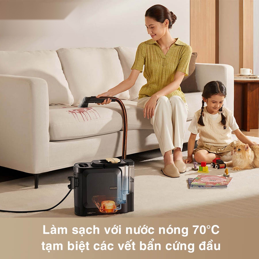 Máy làm sạch thảm di động Dreame N20 Steam sử dụng nước nóng 70°C để phá vỡ cấu trúc dầu mỡ và bụi bẩn bám sâu trong sợi vải, mang lại hiệu quả làm sạch vượt trội hơn hẳn so với nước lạnh thông thường. Nhiệt độ cao giúp làm tan vết bẩn cũ, cứng đầu trên thảm, sofa hay ghế xe hơi, đồng thời hỗ trợ quá trình diệt khuẩn tự nhiên, trả lại vẻ sạch mới cho từng sợi vải.