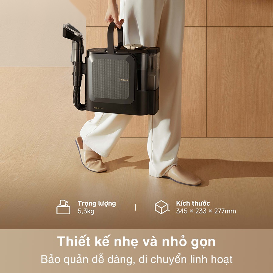 Máy làm sạch thảm di động Dreame N20 Steam sở hữu thiết kế nhỏ gọn chỉ 345 × 233 × 277 mm và trọng lượng nhẹ 5.5kg, giúp bạn dễ dàng di chuyển giữa các phòng mà không tốn sức. Dù là dọn dẹp phòng khách, phòng ngủ hay nội thất ô tô, việc cầm nắm và thao tác đều trở nên nhẹ nhàng, linh hoạt.