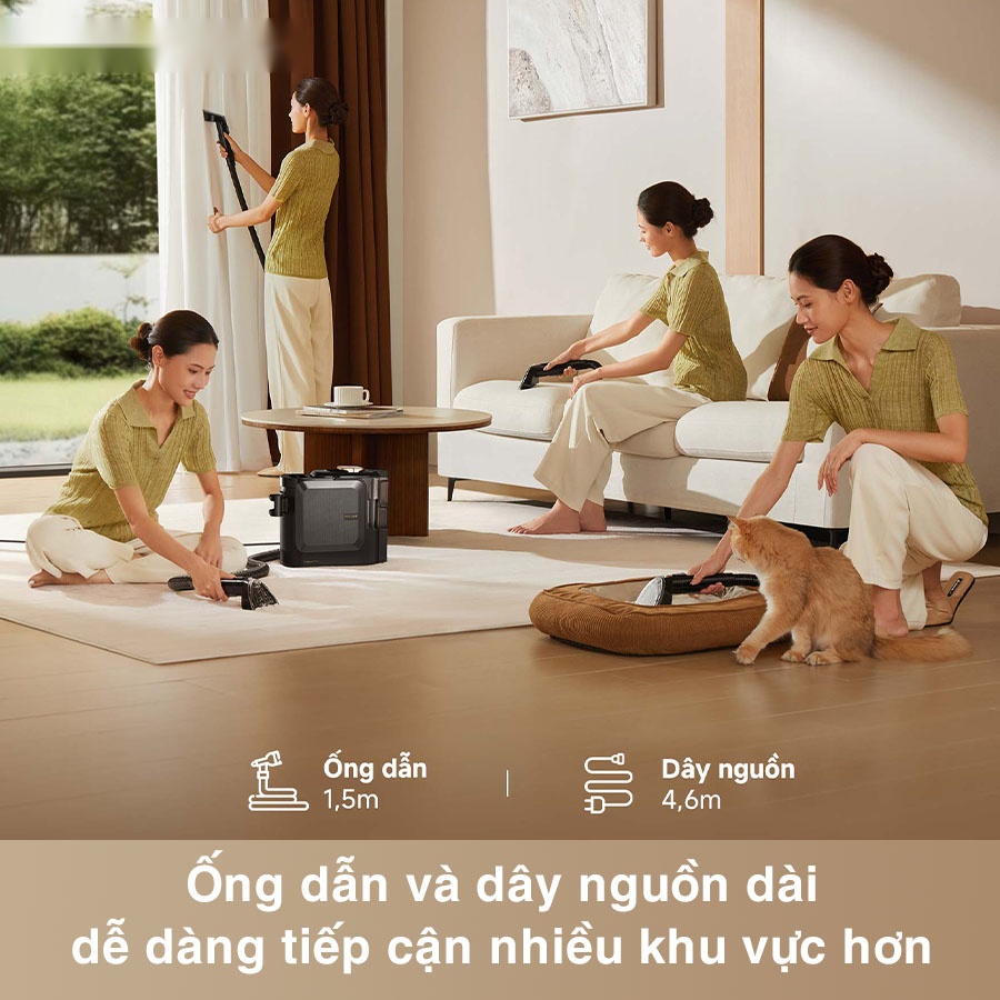 Với ống dẫn dài 1.5m và dây điện 4.6m, máy làm sạch thảm di động Dreame N20 Steam cho phép bạn vươn xa hơn mà không cần di chuyển máy liên tục. Thiết kế này mang lại sự tiện lợi tối đa khi làm sạch khu vực rộng, góc khuất hoặc các vị trí khó tiếp cận, giúp công việc vệ sinh diễn ra liền mạch, nhanh chóng và thoải mái hơn bao giờ hết.