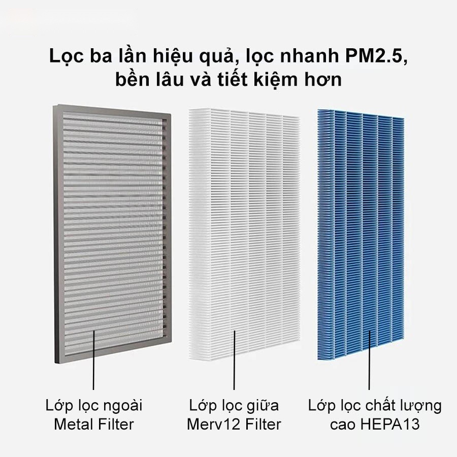 Tiếp theo là bộ lọc MERV12, cung cấp khả năng lọc sạch PM2.5 và các hạt bụi mịn, đem lại một không gian sống không chỉ sạch mà còn an toàn. Cuối cùng, bộ lọc HEPA13 hiệu suất cao, giữ lại hầu hết các loại bụi siêu mịn và các hạt gây ô nhiễm, mang đến một lớp bảo vệ lâu dài và hiệu quả cho gia đình bạn.