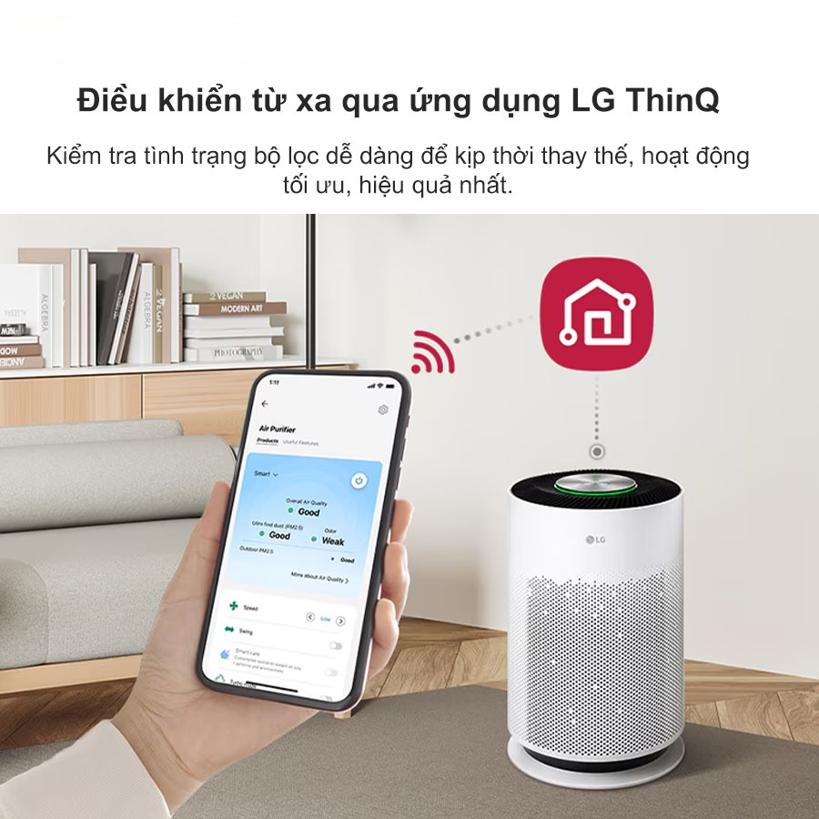 Máy lọc không khí LG PuriCare 360 Hit còn tích hợp công nghệ LG ThinQ™, cho phép bạn dễ dàng kiểm soát thiết bị từ xa thông qua điện thoại thông minh. Dù bạn ở đâu, chỉ cần một vài thao tác đơn giản, bạn có thể bật máy lọc không khí để chuẩn bị không gian trong lành chờ đón gia đình, đặc biệt hữu ích trong những ngày chất lượng không khí kém hoặc ô nhiễm.