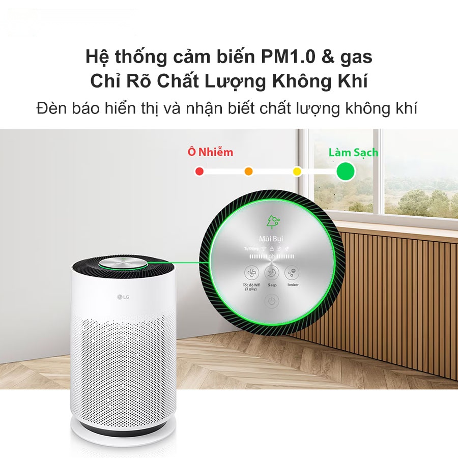 Một điểm nổi bật khác của máy lọc không khí LG PuriCare 360 Hit là hệ thống cảm biến thông minh PM 1.0, cho phép máy xác định chất lượng không khí trong thời gian thực một cách dễ dàng. Thông qua hệ thống đèn LED với nhiều màu sắc, bạn có thể biết ngay được tình trạng không khí trong nhà mình. Với màu đỏ thể hiện chất lượng không khí kém, màu cam cho chất lượng trung bình, vàng là chất lượng khá và màu xanh thể hiện không khí sạch. Điều này giúp bạn có thể dễ dàng theo dõi và điều chỉnh máy một cách kịp thời, giữ cho môi trường không khí trong gia đình luôn an toàn, sạch sẽ.