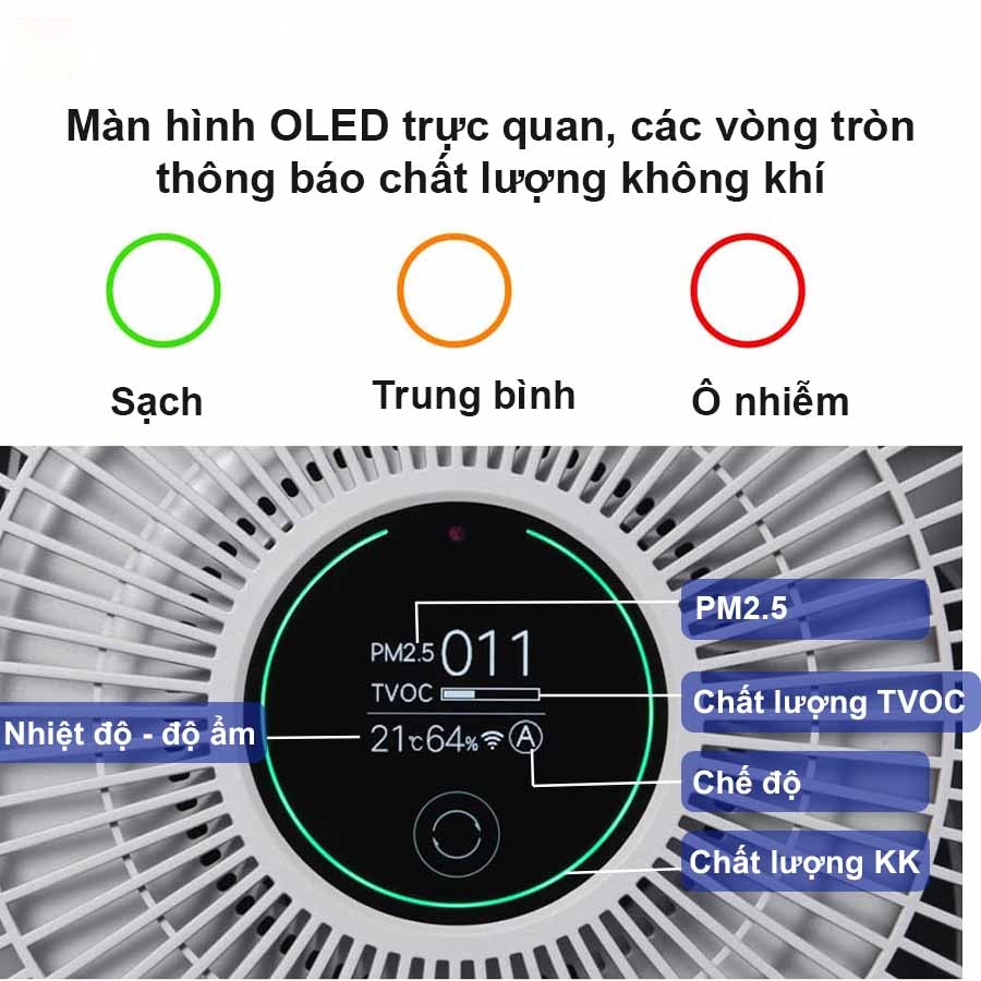 Máy Lọc Không Khí Smartmi Air Purifier với màn hình OLED ngay phía trên máy lọc vừa vặn tầm nhìn, cung cấp các thông số chi tiết về môi trường xung quanh như bụi PM 2.5, TOVC, nhiệt độ và độ ẩm ngay tại thời điểm đó. Giúp bạn dễ dàng theo dõi chất lượng không khí trong phòng. Từ đó điều chỉnh chế độ phù hợp