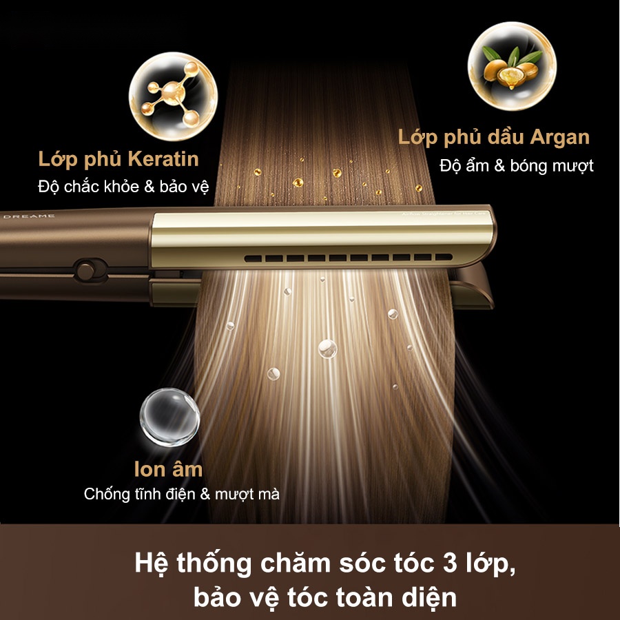 Máy sấy duỗi tóc Dreame Aero Straight không chỉ tạo kiểu mà còn nuôi dưỡng mái tóc nhờ hệ thống chăm sóc 3 lớp. Lớp phủ dưỡng chất siêu mỏng và thoáng khí bao bọc từng sợi tóc, khóa ẩm hiệu quả, giảm xoăn rối và duy trì độ bóng khỏe dài lâu.