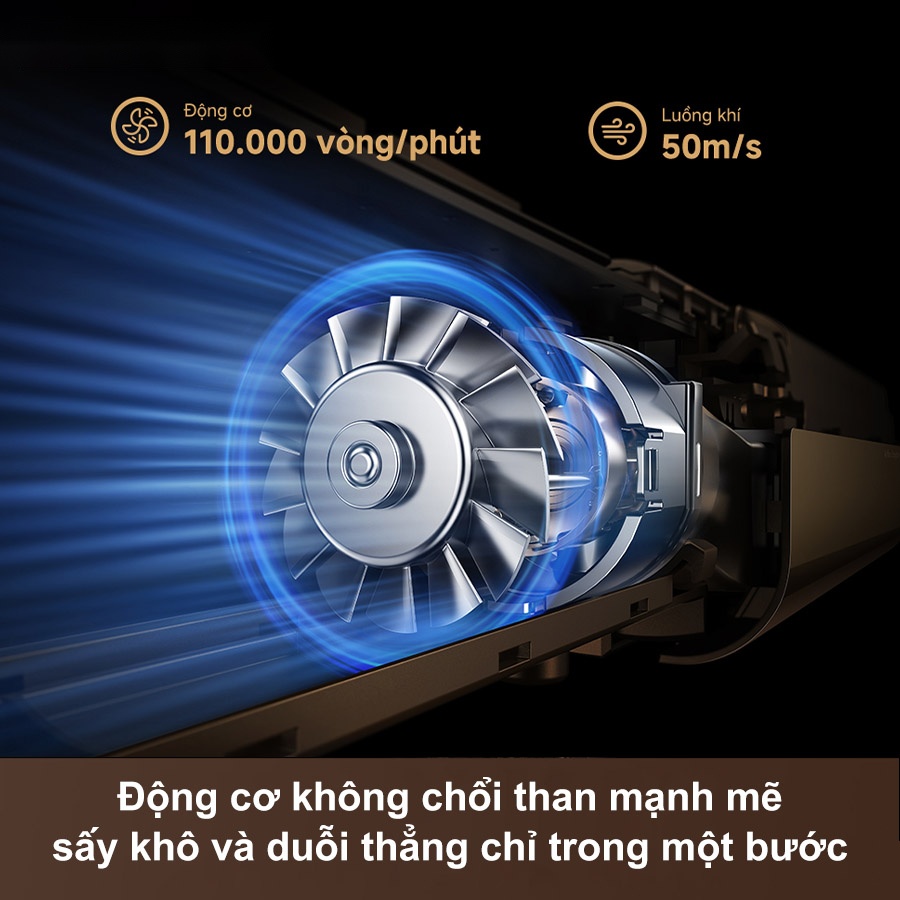 Trái tim của máy sấy duỗi tóc Dreame Aero Straight chính là động cơ không chổi than hoạt động ở tốc độ 110.000 vòng/phút, tạo luồng khí đạt 50 m/s cùng lưu lượng 45 m³/h. Nhờ sức mạnh này, tóc vừa nhanh khô vừa được duỗi thẳng chỉ trong một bước, mang đến trải nghiệm làm đẹp nhanh chóng, an toàn và hiện đại.