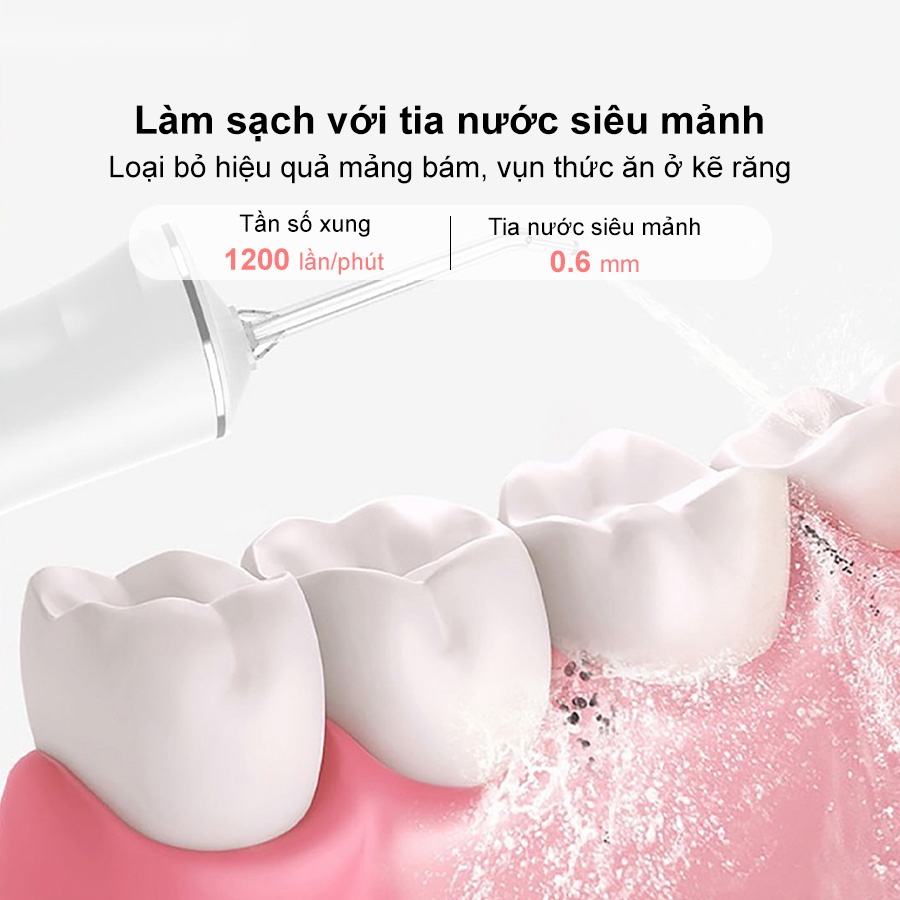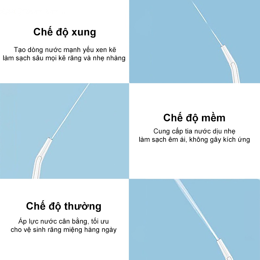 - Chế độ bình thường: áp lực nước cân bằng, tối ưu cho vệ sinh răng miệng hàng ngày, phù hợp với mọi đối tượng, giúp duy trì hàm răng sáng khỏe và hơi thở thơm mát.