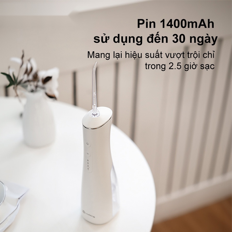 Máy tăm nước Lumias LWF-180W được trang bị pin dung lượng 1400mAh, mang lại hiệu suất vượt trội với thời gian sử dụng lên đến 30 ngày chỉ trong một lần sạc đầy với tần suất sử dụng 2 lần/ngày. Sạc nhanh qua cổng Type-C tiện lợi, sạc đầy chỉ trong 2.5 giờ, kết hợp tính năng tự động bảo vệ pin, đảm bảo độ an toàn và tuổi thọ lâu dài cho thiết bị. Đây là lựa chọn lý tưởng cho những chuyến công tác hay du lịch, giúp bạn duy trì thói quen chăm sóc răng miệng hiệu quả mọi lúc, mọi nơi, mang đến nụ cười tự tin và hơi thở thơm mát.