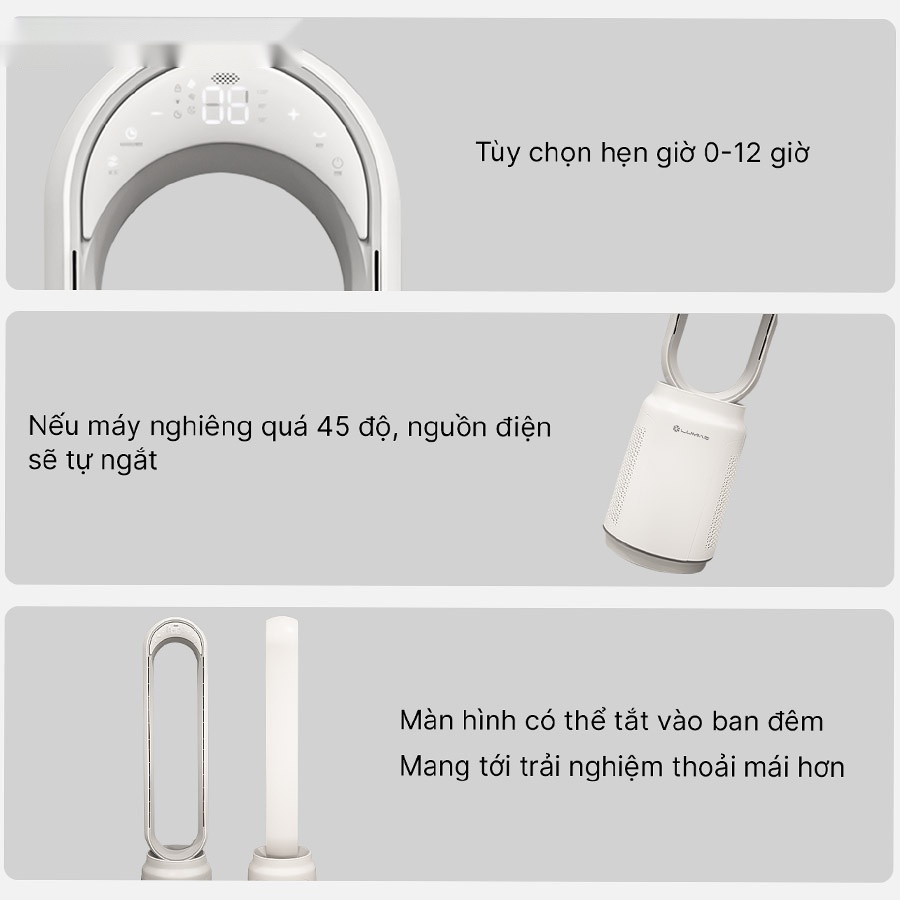 Quạt không cánh Lumias T08 được trang bị tính năng tự động tắt nguồn khi quạt nghiêng quá 45°, đảm bảo an toàn khi sử dụng. Tính năng này giúp ngăn chặn nguy cơ đổ ngã, bảo vệ thiết bị và người sử dụng khỏi các tình huống nguy hiểm.