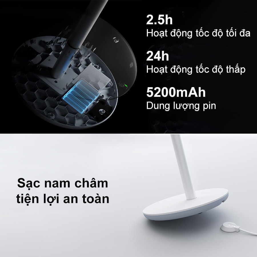 Quạt trang bị hệ thống sạc từ tính thay vì cắm dây truyền thống vô cùng tiện lợi và an toàn với trẻ nhỏ, vật nuôi.