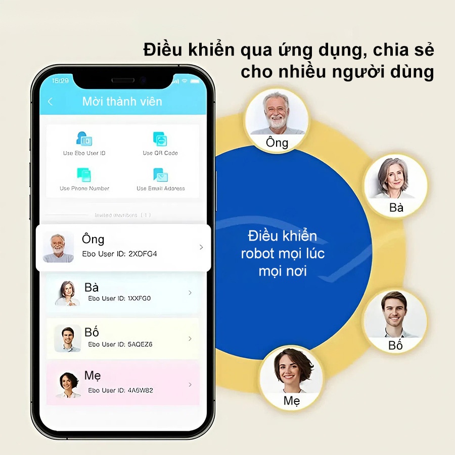 Robot camera giữ nhà EBO SE được quản lý thông qua ứng dụng EBO trên điện thoại, cho phép người dùng điều khiển robot mọi lúc mọi nơi. Tài khoản chính có thể chia sẻ quyền truy cập cho các thành viên trong gia đình để cùng theo dõi và tương tác. Việc chia sẻ này giúp tăng tính linh hoạt và tiện ích khi sử dụng.