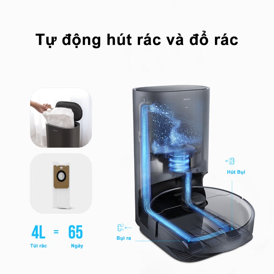 Trong khi sạc pin dock sạc thông minh sẽ hút toàn bộ lượng rác có chứa trong hộp rác của robot để hút vào trong dock sạc. Bạn sẽ không còn phải dọn dẹp robot hàng ngày nữa, thay vào đó 1 tuần, 1 tháng bạn sẽ phải đổ rác 1 lần.