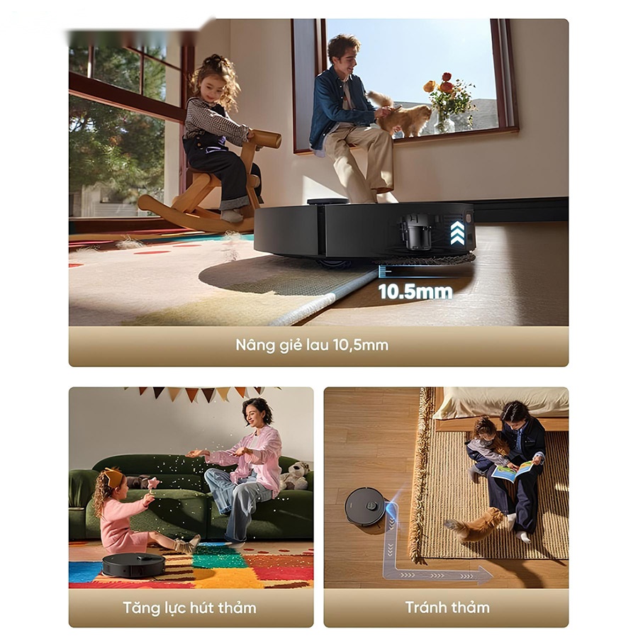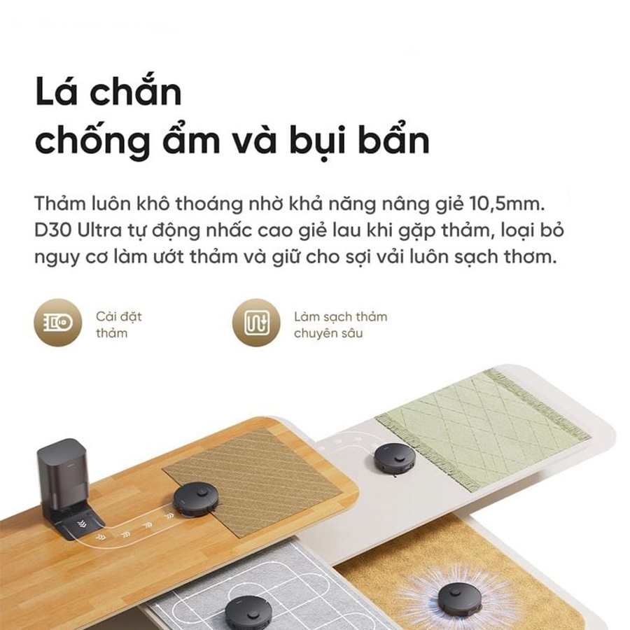 - Tránh thảm hoàn toàn: Tự động né tránh hoàn toàn khu vực thảm trong suốt chu trình di chuyển
