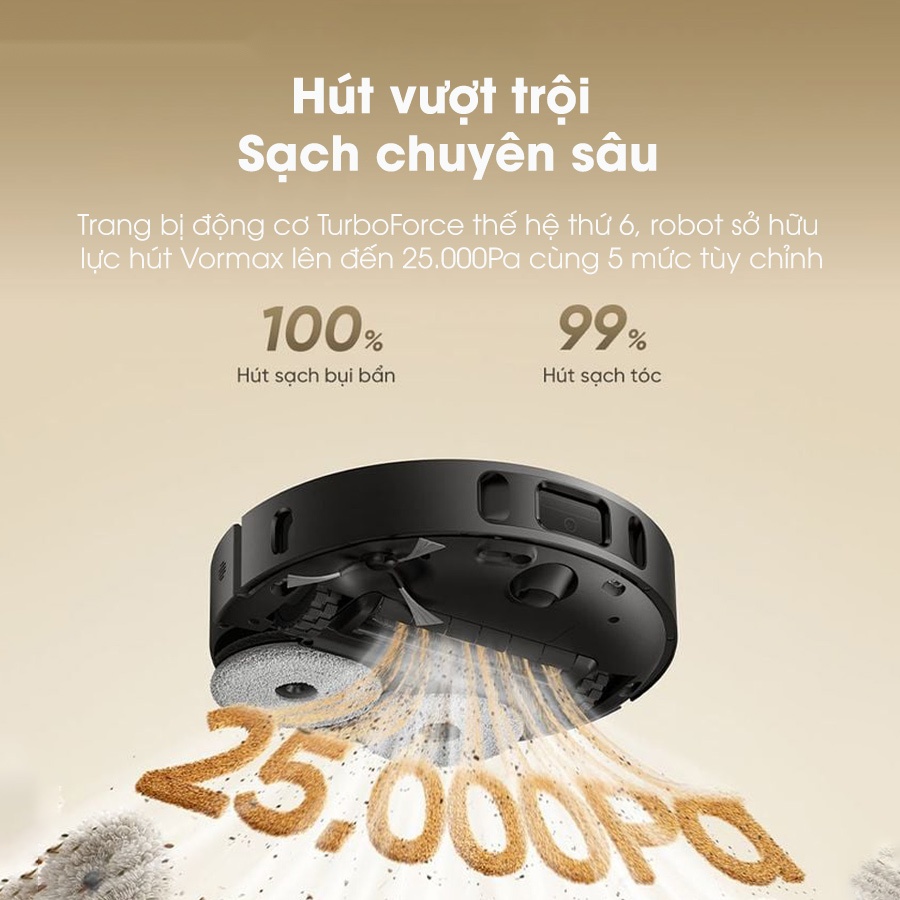 - Lực hút Vormax mạnh mẽ 25.000Pa: Đảm bảo thu gom triệt để các loại bụi bẩn trên nhiều bề mặt