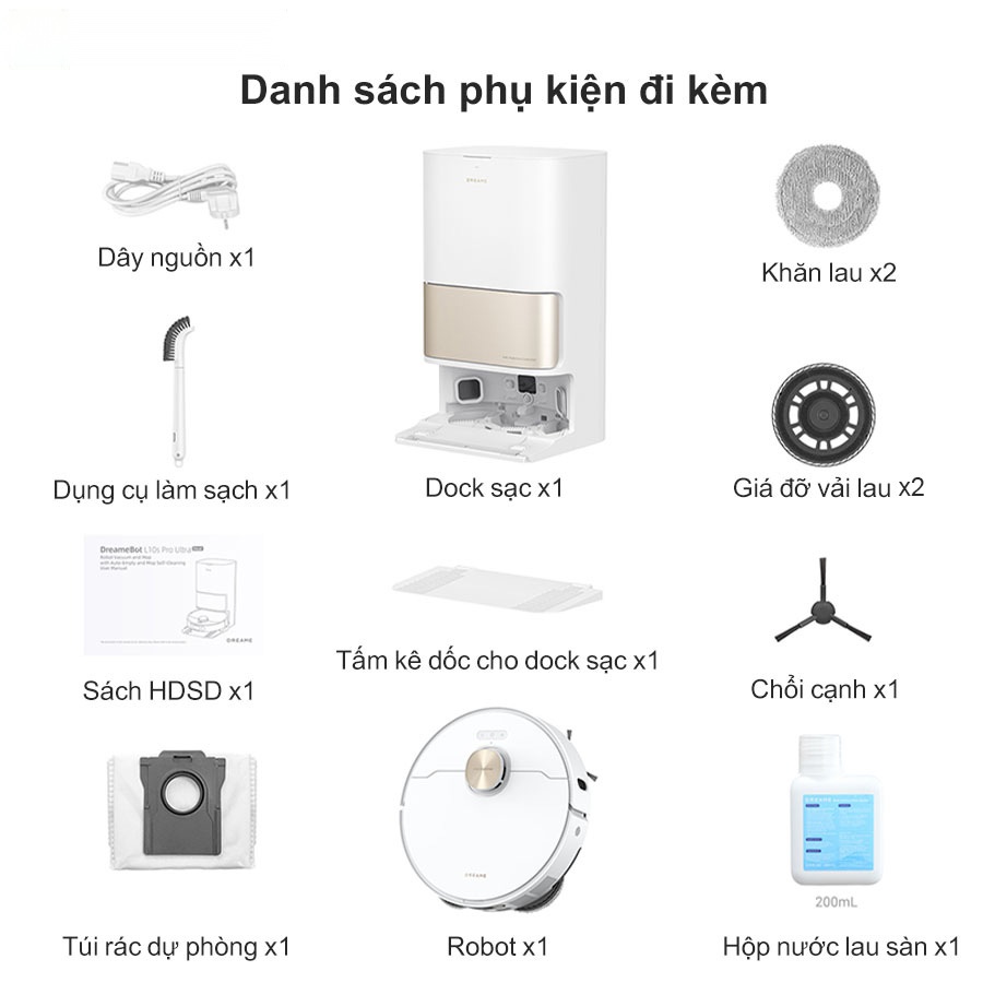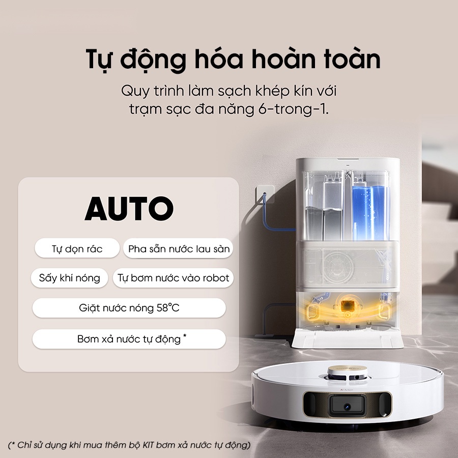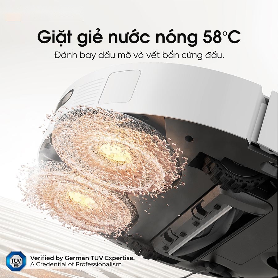 - Dock sạc đa năng tự động hút rác, giặt giẻ bằng nước nóng 58°C, sấy khô giẻ lau, thêm nước lau sàn, tự động bơm nước sạch, xả nước bẩn.