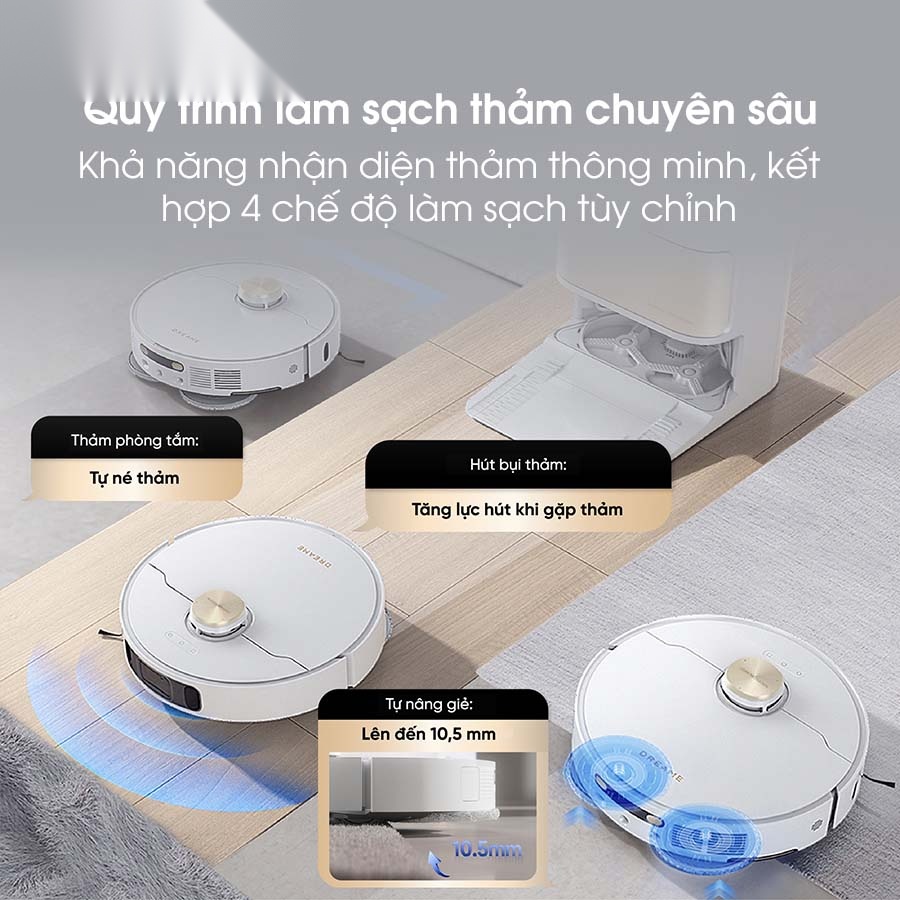 Robot hút bụi Dreame L10s Pro Ultra có khả năng nhận diện thảm thông minh, cùng với đó là 4 chế độ làm sạch thảm tùy chỉnh. Người dùng sẽ có đa dạng lựa chọn hơn cho việc làm sạch thảm trong ngôi nhà của mình, cụ thể như sau: