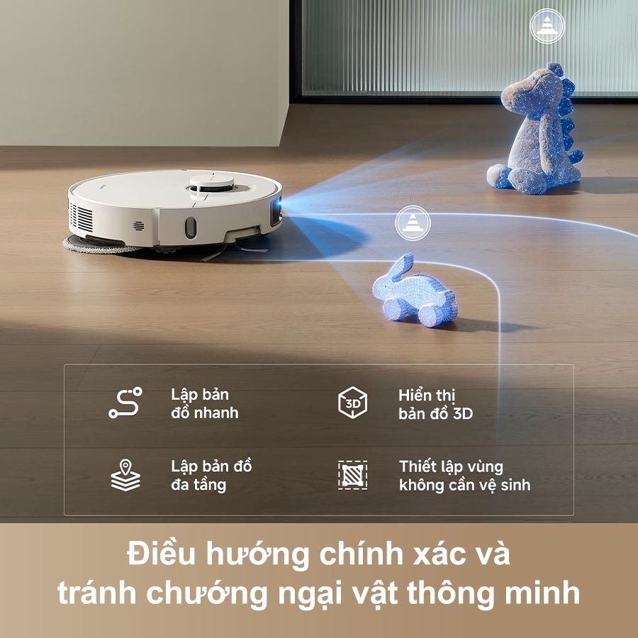 Robot có khả năng lưu trữ bản đồ chi tiết lên đến 4 tầng, phù hợp cho nhà nhiều lầu hoặc căn hộ phức hợp. Mỗi tầng đều được robot tự động nhận diện, phân vùng và thiết lập lộ trình làm sạch riêng biệt. Nhờ đó, người dùng không cần thiết lập lại thủ công mỗi khi robot di chuyển giữa các khu vực.