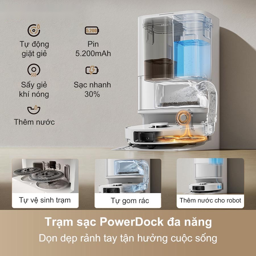 Trạm sạc của Dreame L10s Ultra Gen 3 không chỉ là nơi nạp năng lượng mà còn là hệ thống tự làm sạch hoàn toàn tự động. Sau mỗi chu kỳ lau, robot sẽ trở về trạm để giặt giẻ bằng nước sạch và loại bỏ đến 99% vết bẩn còn bám lại. Nhờ đó, mỗi lần robot hoạt động đều ổn định, luôn đảm bảo giẻ lau sạch sẽ, không để lại vệt bẩn hay mùi khó chịu.