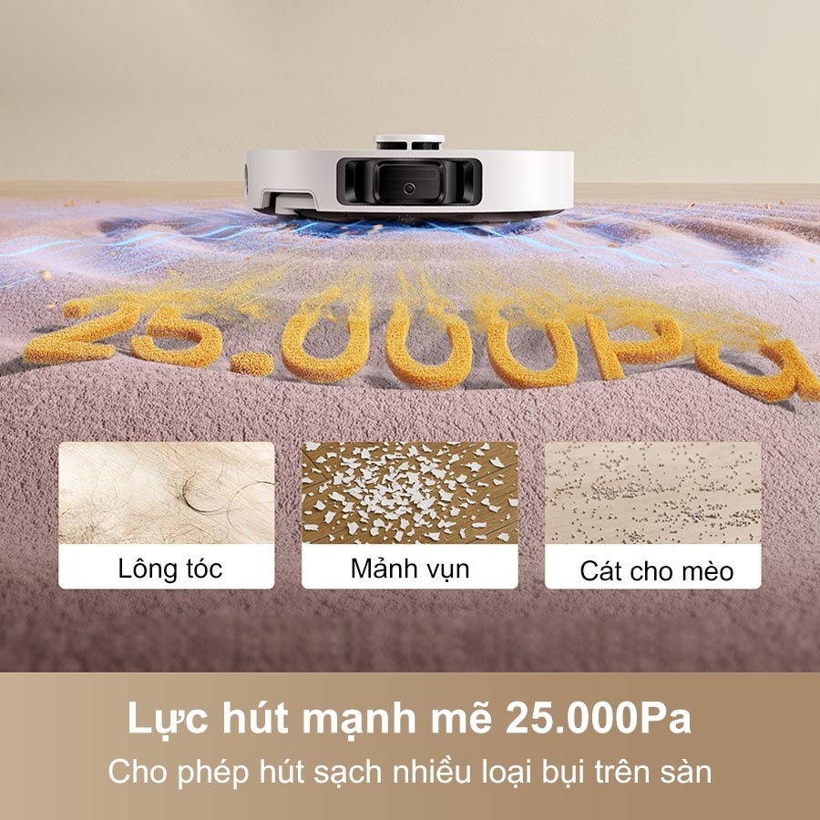 Lực hút mạnh mẽ 25.000Pa hút sạch bụi bẩn trong một lần di chuyển