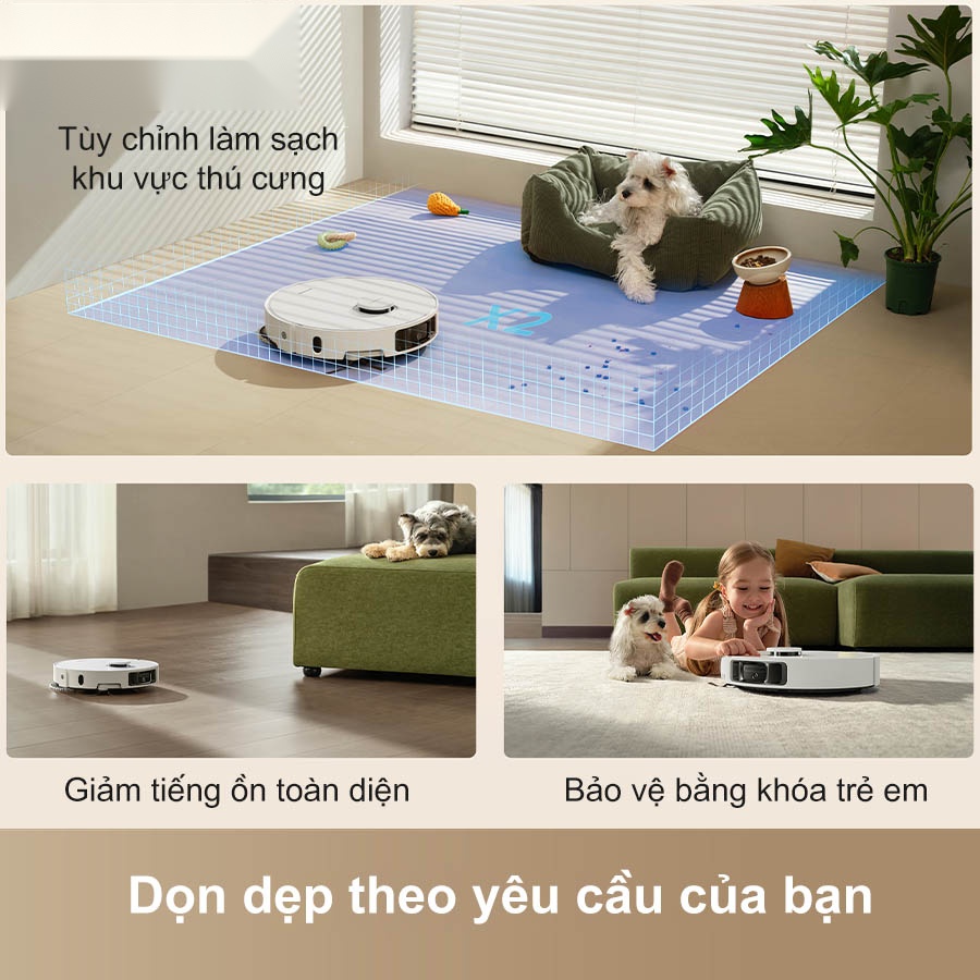 Robot hút bụi Dreame L10s Ultra Gen 3 hướng đến môi trường sống an toàn và thân thiện với vật nuôi. Robot cho phép tùy chỉnh chế độ vệ sinh riêng cho khu vực thú cưng, đồng thời tích hợp khóa trẻ em (Child Lock) và công nghệ giảm ồn toàn diện, giúp quá trình làm sạch diễn ra êm ái, không làm phiền giấc ngủ hay sinh hoạt hàng ngày.
