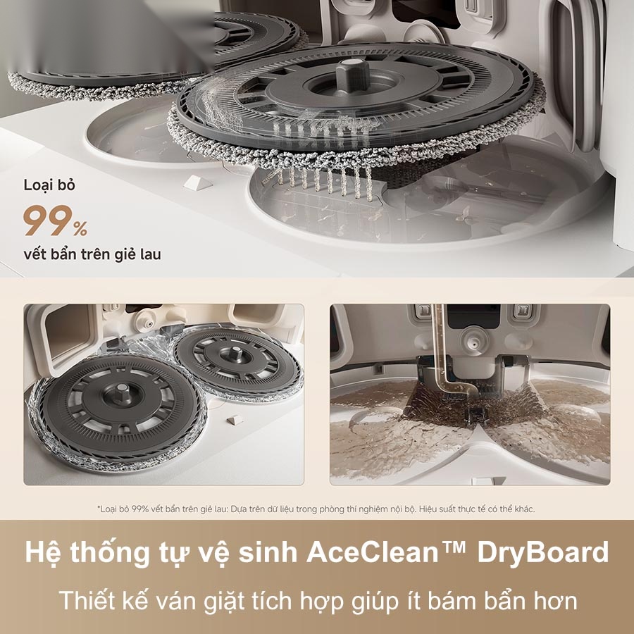 - Tự giặt giẻ lau bằng hệ thống 20 vòi phun áp lực cao, loại bỏ hoàn toàn cặn bẩn còn sót lại.