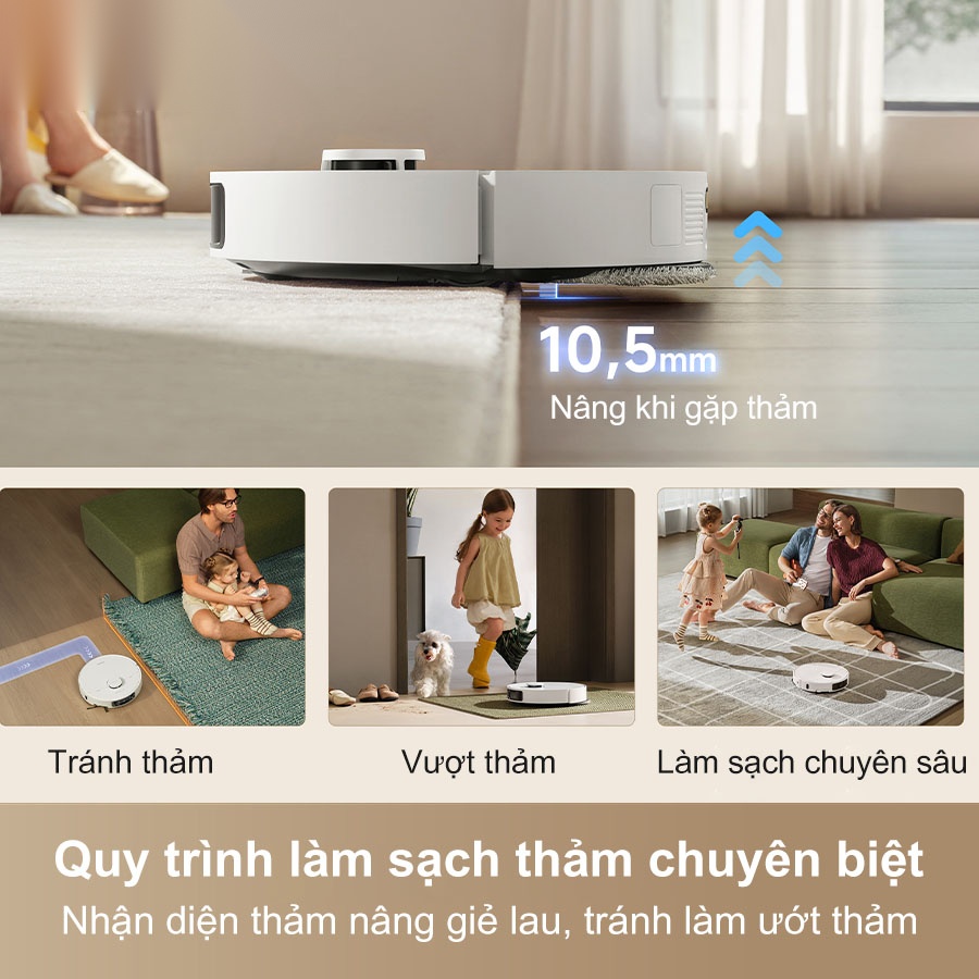 Khi phát hiện khu vực trải thảm, robot sẽ tự động nâng giẻ lau lên cao tối đa 10.5 mm, ngăn nước và bụi bẩn truyền sang bề mặt thảm. Cơ chế này giúp bảo vệ cả thảm lông ngắn lẫn thảm lông dài, đồng thời cho phép robot di chuyển linh hoạt giữa các loại sàn mà không cần người dùng can thiệp.