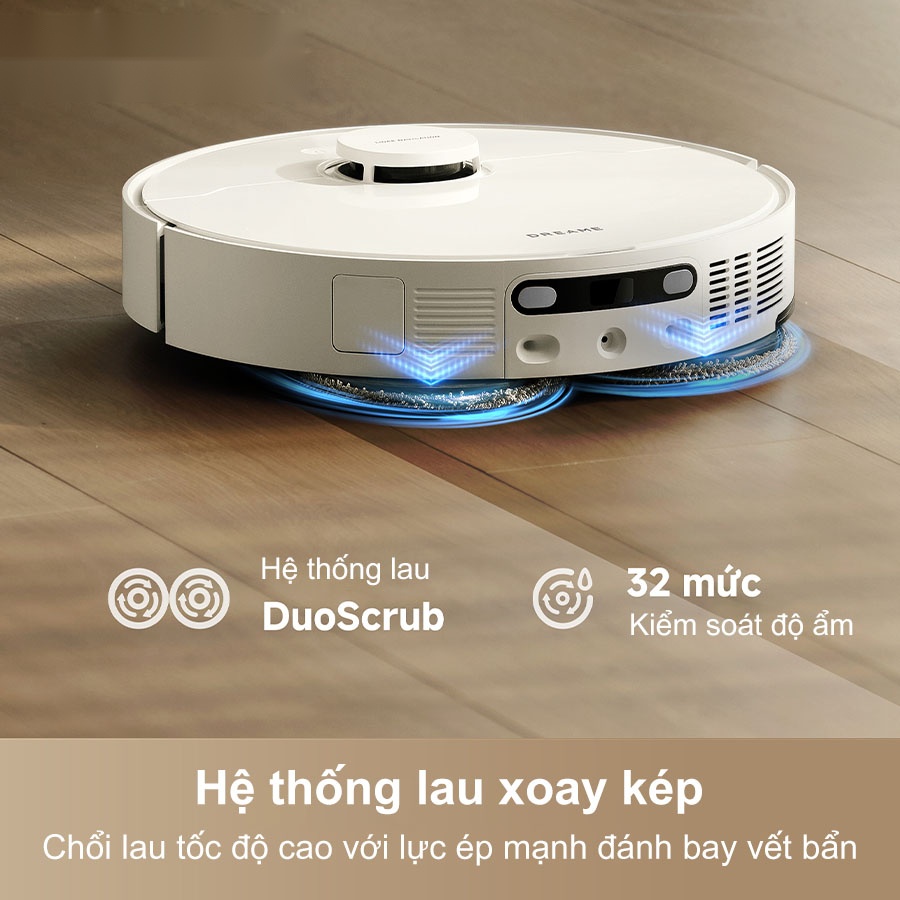 Robot hút bụi lau nhà Dreame L10s Ultra Gen 3 được trang bị hệ thống lau DuoScrub gồm hai đĩa lau quay tốc độ cao, giúp đánh bay mọi vết bẩn cứng đầu và mang lại sàn khô nhanh, thân thiện với thú cưng. Đặc biệt, công nghệ điều chỉnh độ ẩm 32 cấp độ cho phép robot kiểm soát chính xác lượng nước, từ khô nhẹ, ẩm vừa đến ướt kỹ, phù hợp với từng loại sàn khác nhau. Nhờ đó, sàn gỗ không bị thấm nước, gạch men được làm sạch sâu, còn thảm luôn khô ráo như mới.