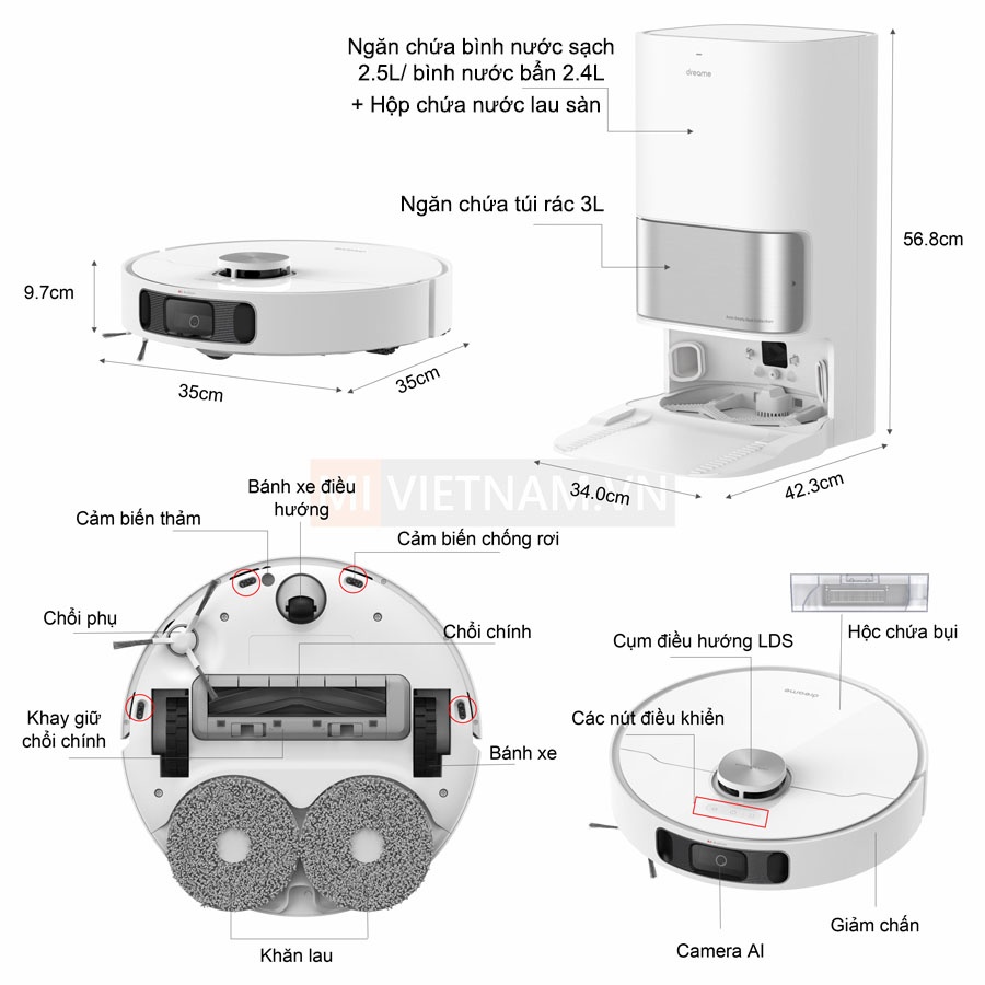 - Dock sạc hoàn toàn mới : hệ thống làm sạch gồm 1 bình chứa rác 3L, bình chứa nước sạch và nước bẩn có dung tích là 2.5 L. Ngoài ra, dock sạc này có thể kết hợp với bộ kit bơm xả nước tự động (phụ kiện bán rời) để tự động bơm nước sạch vào và xả nước bẩn ra khỏi bình chứa