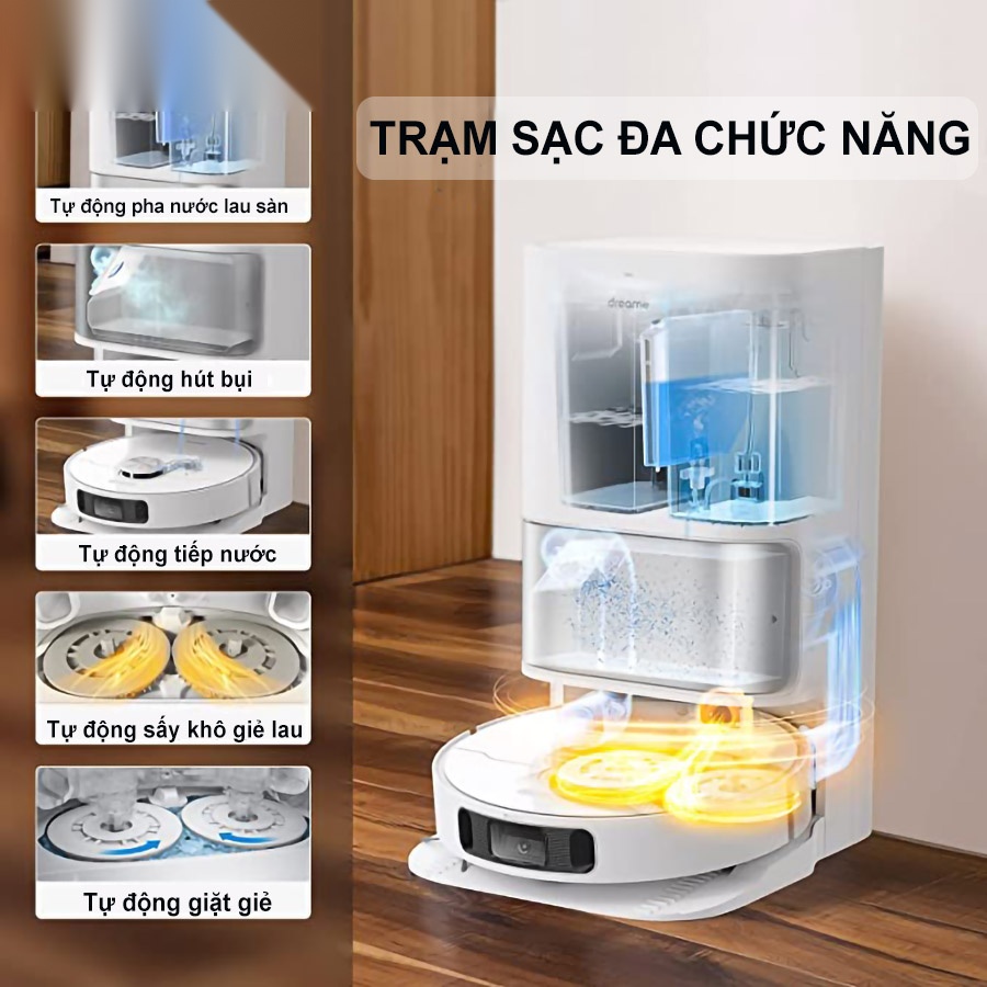 - Công nghệ sấy khô: Sau khi hoàn thành xong việc dọn dẹp, robot tự động quay về dock sạc để giặt và sấy khô giẻ lau. Qua đó giúp ngăn chặn sự phát triển của vi khuẩn gây hại, nấm mốc và mùi hôi khó chịu.