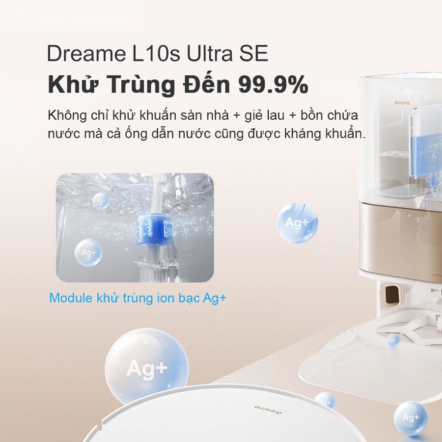Robot hút lau nhà Dreame L10s Ultra SE là phiên bản sản phẩm cải tiến hoàn hảo từ dòng Dreame L10s Ultra, kế thừa toàn bộ những tính năng, công nghệ hiện đại và đột phá. Thêm vào đó là khả năng khử trùng nước với modul tiệt trùng bằng ion Ag+ không chỉ khử khuẩn trên sàn nhà, giẻ lau, bồn chứa nước mà đến cả ống dẫn nước cũng được khử khuẩn.